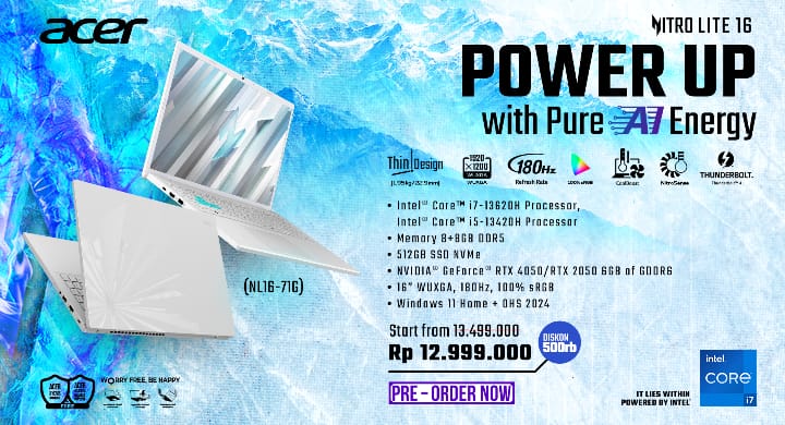Nitro Lite tersedia untuk pre-order mulai April 2025, dengan harga mulai dari Rp 12.999.000, termasuk Windows 11 Home, Office Home 2024, serta Office 365 Basic gratis selama 1 tahun.