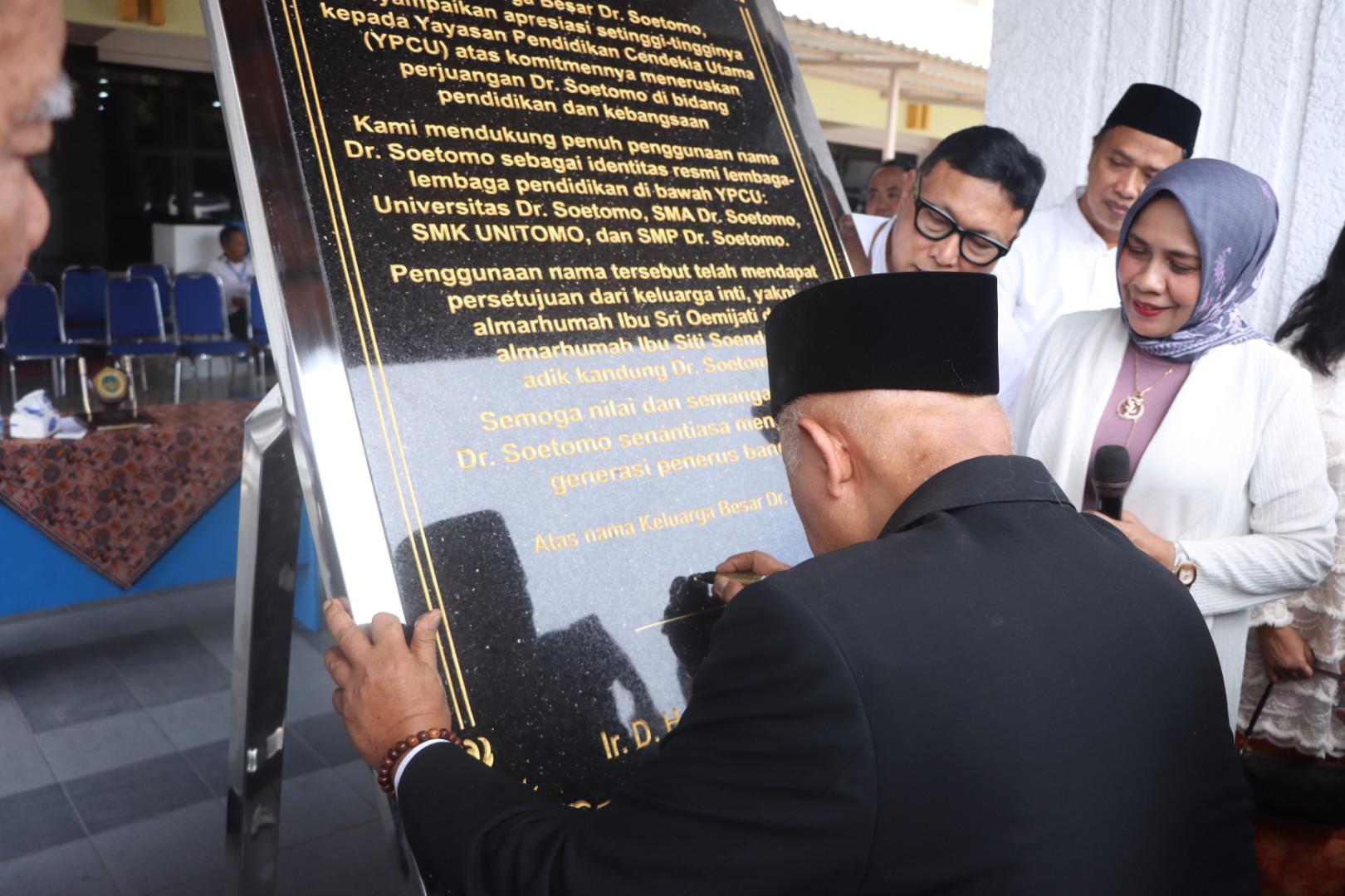 Prasasti tersebut menjadi simbol pengingat akan perjuangan dr. Soetomo dalam mencerdaskan kehidupan bangsa serta tertuang restu keluarga besar dr. Soetomo pada civitas academica menggunakan nama Pahlawan Nasional ini. Nuansa khidmat terasa kuat selama acara yang dihadiri civitas akademika, perwakilan SMA Dr. Soetomo, SMK Unitomo serta SMP Dr. Soetomo.