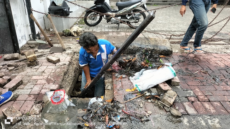 Petugas Dinas CKPKP Gresik saat membersihkan draine yang dipenuhi sampah
