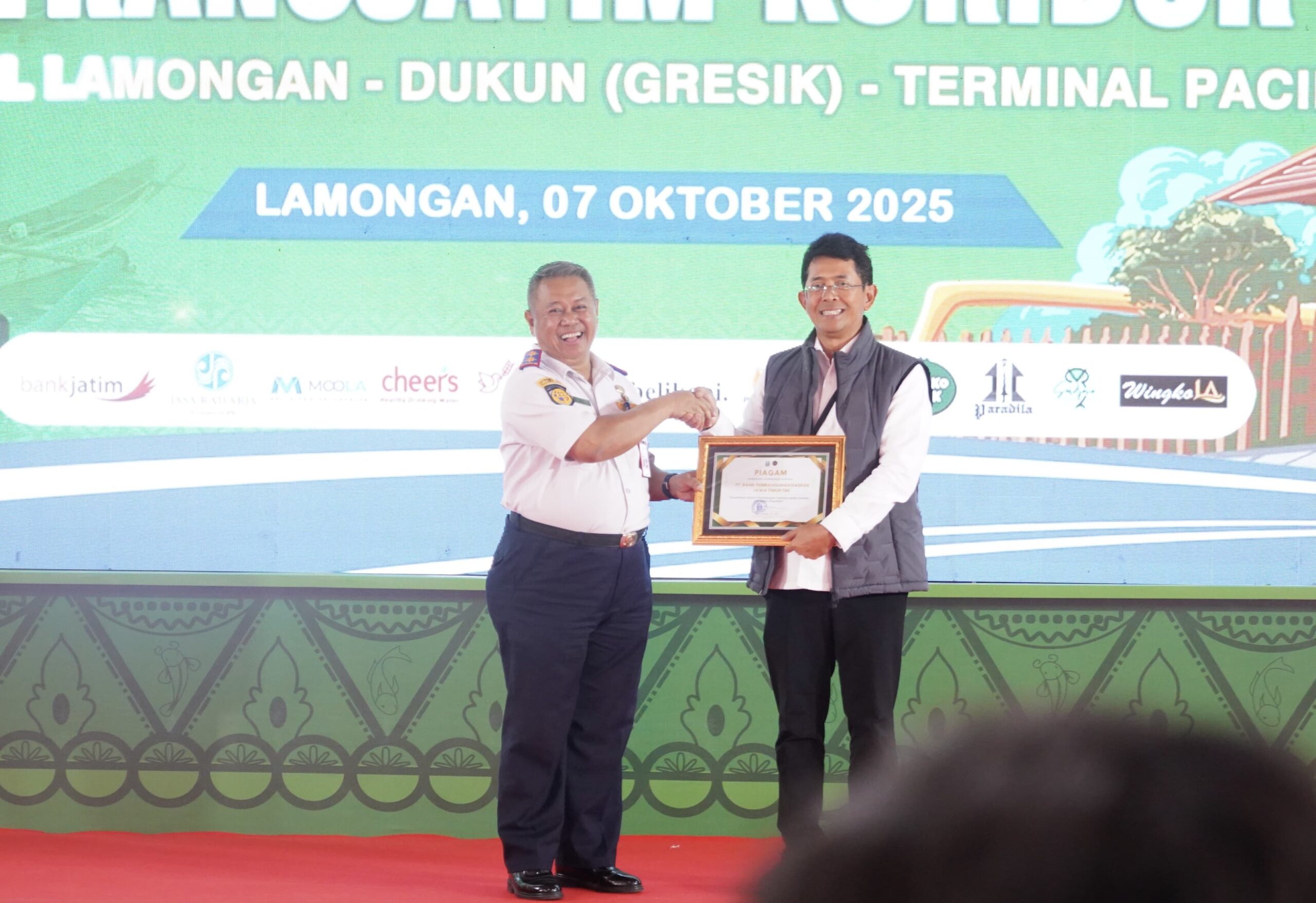 LAMONGAN l bidik.news – Sebagai wujud dukungan dan komitmen mendukung kemajuan infrastruktur dan layanan publik di Jawa Timur, PT Bank Pembangunan Daerah Jawa Timur Tbk (Bank Jatim) pada hari Selasa (7/10) turut berpartisipasi dalam kegiatan Peresmian Operasional Bus Trans Jatim Koridor VII Terminal Lamongan-Dukun (Gresik)-Terminal Paciran. Bertempat di Halaman Parkir Makam Sunan Drajad Lamongan, kegiatan tersebut dihadiri oleh Gubernur Jawa Timur Khofifah Indar Parawansa, Direktur Utama Bank Jatim Winardi Legowo, Kepala Dishub Jatim Nyono, Bupati Lamongan Yuhronur Efendi, Pengasuh Ponpes Sunan Drajat KH Abdul Ghofur, serta sejumlah pejabat dan stakeholder terkait.