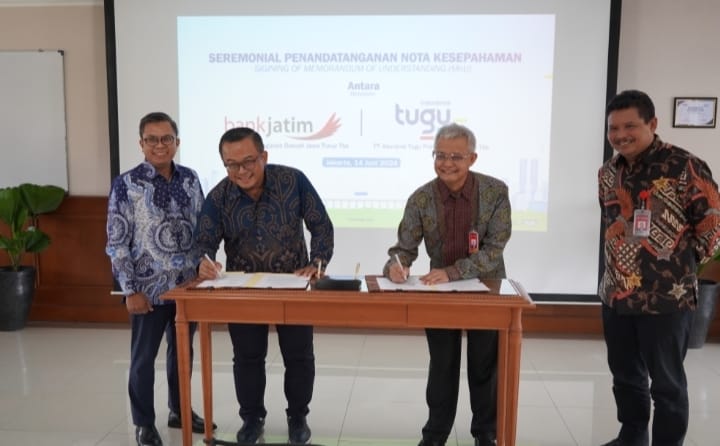 JAKARTA l bidik.news – Untuk memperkuat sinergitas dengan berbagai pihak, PT Bank Pembangunan Daerah Jawa Timur Tbk (bankjatim) baru saja melaksanakan penandatanganan nota kesepahaman (MoU) dengan PT Asuransi Tugu Pratama Indonesia Tbk (Tugu Insurance) pada hari Jumat (14/6). Nota kesepahaman yang diteken tersebut berisi tentang layanan jasa keuangan serta asuransi untuk nasabah bankjatim. Bertempat di Wisma Tugu 1 Jakarta, kegiatan penandatanganan MoU itu dihadiri oleh Plt. Direktur Operasi bankjatim Zulhelfi Abidin, Direktur Kepatuhan dan Manajemen Risiko Tugu Insurance Edi Yoga Prasetyo, SEVP Korporasi, Sindikasi, dan Kelembagaan bankjatim Koerniawan Prijambodo, dan Deputy Director Tugu Insurance Ibrahim Jauhari.