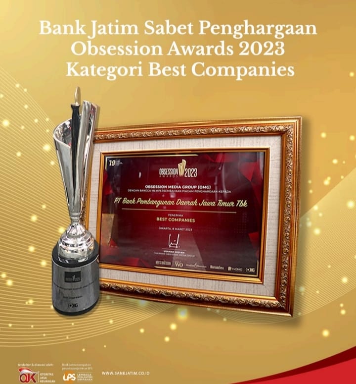 SURABAYA l BIDIK.NEWS – PT Bank Pembangunan Daerah Jawa Timur Tbk atau Bank Jatim tidak henti-hentinya menorehkan prestasi membanggakan. Yang terbaru, Bank Jatim baru saja menyabet penghargaan Obsession Awards 2023 untuk kategori Best Companies. Penghargaan tersebut diberikan oleh Obsession Media Group (OMG) pada Rabu malam (8/3/2023) di Hotel Indonesia Kempinski Jakarta.