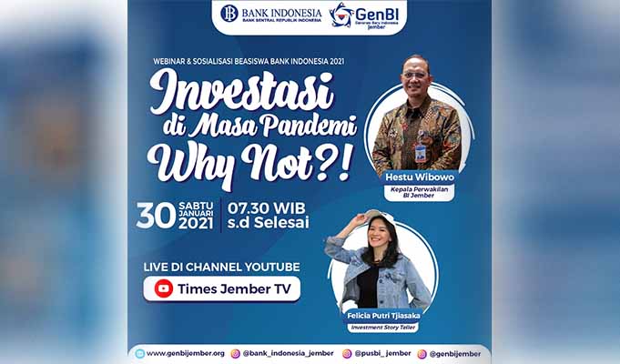 Jember-Kantor Perwakilan (KPw) Bank Indonesia Jember bersama Generasi Beru Indonesia (GenBI) Jember mengadakan webinar dan sosialisasi beasiswa bertajuk “Investasi di Masa Pandemi, Why Not?!”.