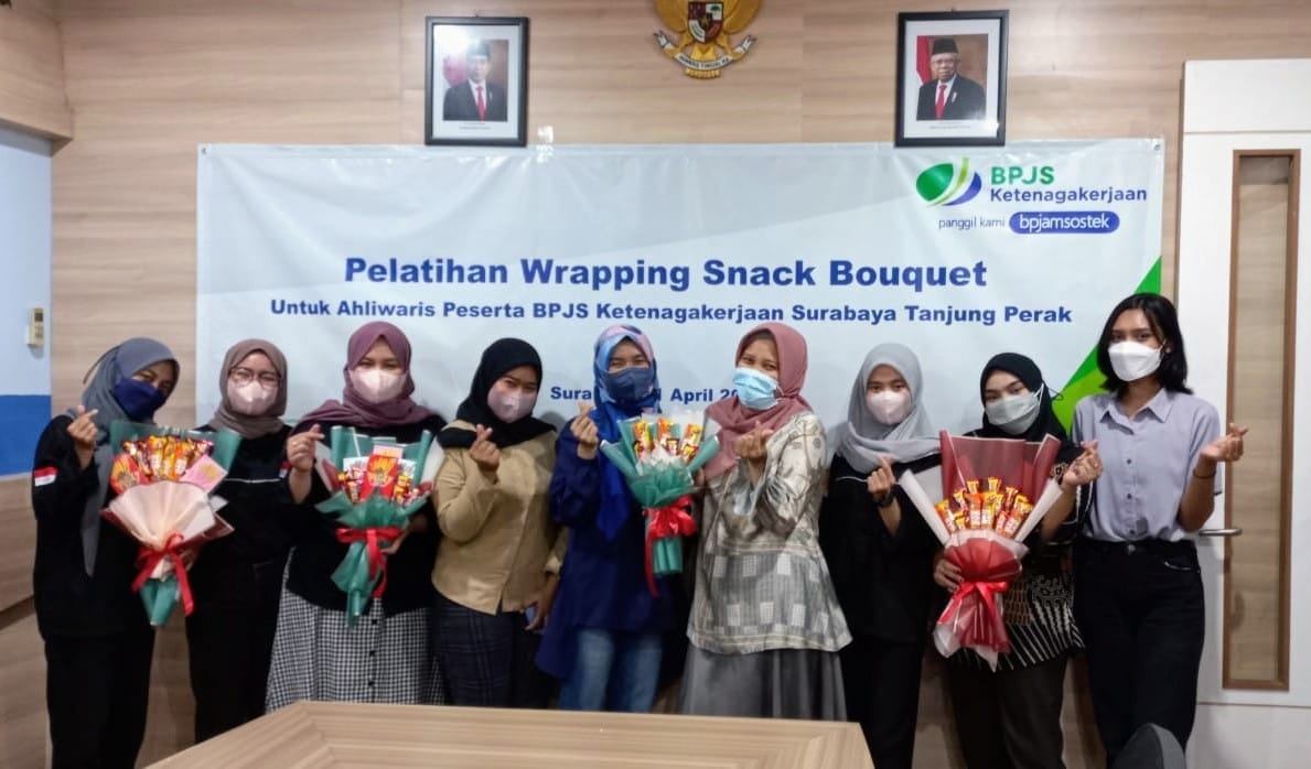 SURABAYA – BPJamsostek (BPJS Ketenagakerjaan) memberi pelatihan wrapping snack bouquet secara luring kepada para anak ahli waris di kantor Cabang Surabaya Tanjung Perak belum lama ini.