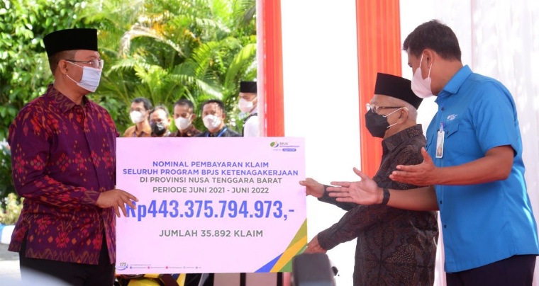 Simbolis santunan yang diserahkan Ma’ruf Amin itu berasal dari 35 ribu lebih klaim manfaat program BPJamsostek di NTB selama periode Juni 2021 hingga saat ini.
