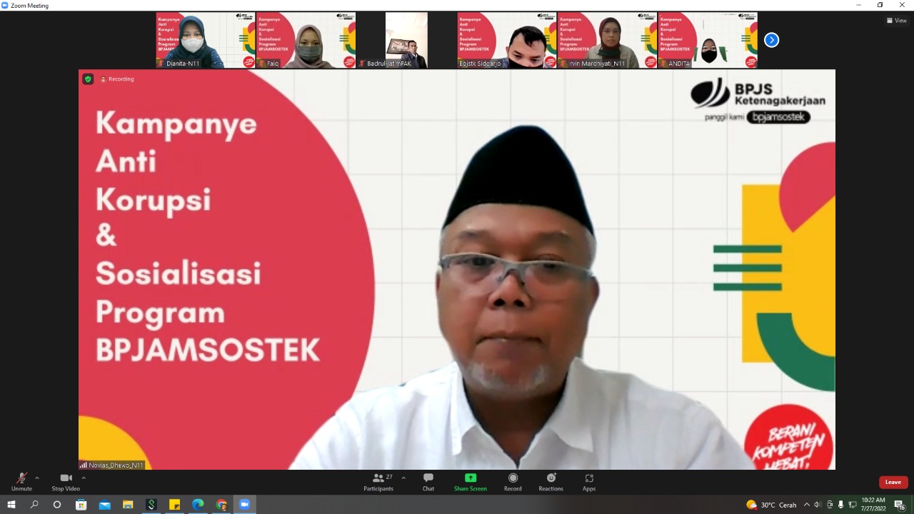 SIDOARJO | BIDIK.NEWS – BPJS Ketenagakerjaan (BPJamsostek) Sidoarjo melakukan sosialisasi bertajuk “Kampanye Anti Korupsi dan Sosialisasi Program BPJamsostek” melalui virtual zoom meeting kepada mahasiswa dari berbagai perguruan tinggi dan siswa-siswi peserta magang, Rabu (27/7/2022).