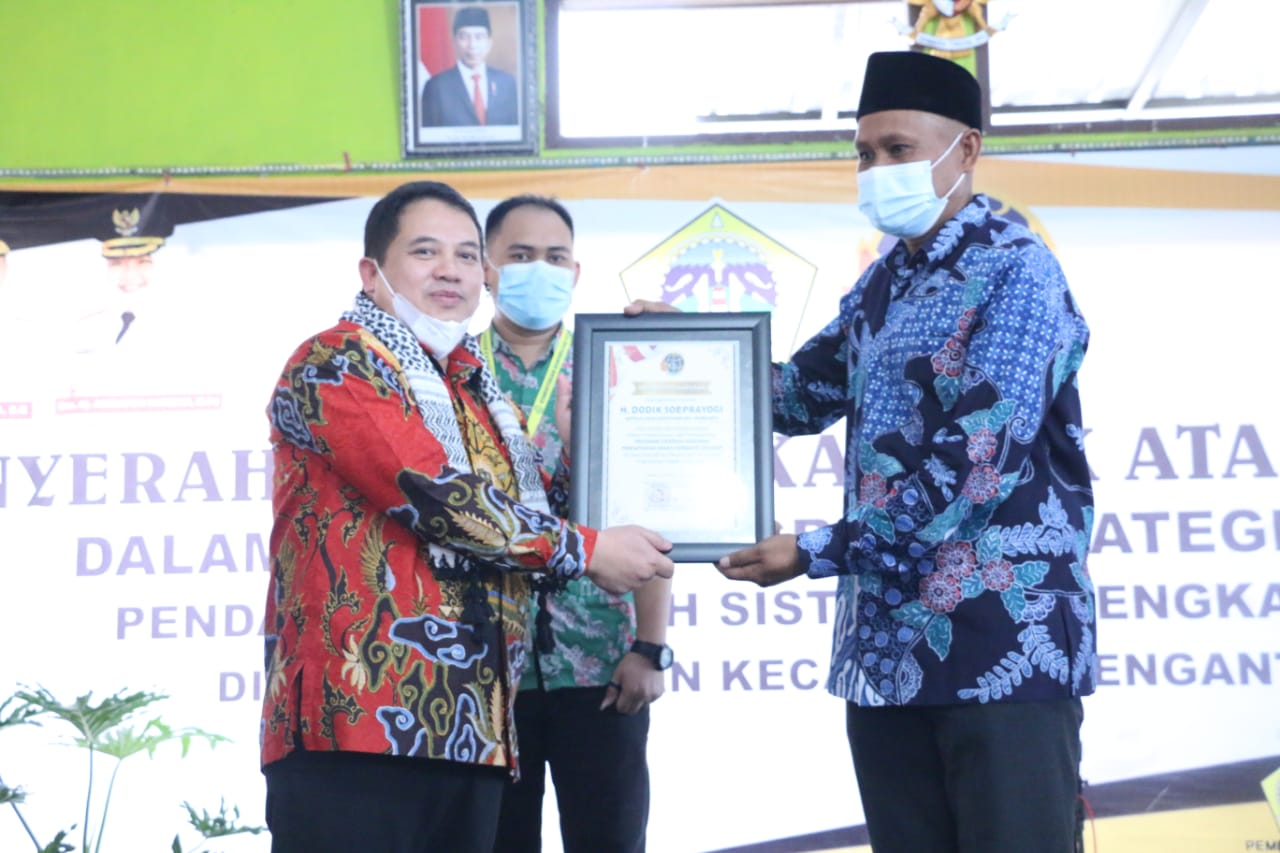 GRESIK – Badan Pertanahan Negara (BPN) Gresik bersama dengan Bupati Gresik menyerahkan secara simbolis 250 sertifikat hak milik melalui program Pendaftaran Tanah Sistematis Lengkap (PTSL) tahun 2021 dari total jumlah 2.060 sertifikat bertempat di desa Kepatihan Menganti, Kamis (23/12).