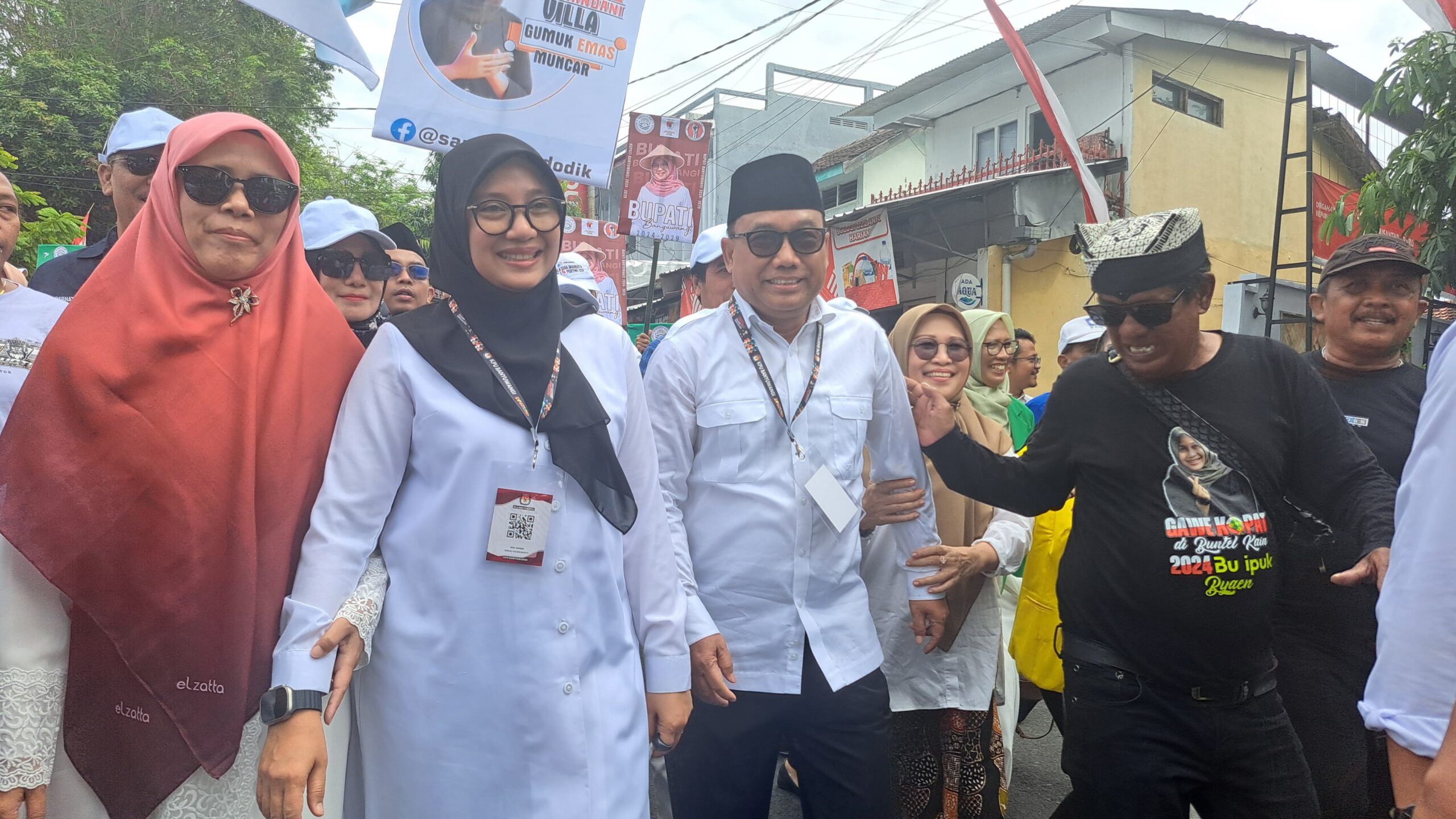Disepanjang jalan, Ipuk-Mujiono melambaikan tangan dan tak henti-hentinya disapa dan dielu-elukan warga. Bahkan, sesekali keduanya berhenti karena antusiasme warga yang berebut ingin bersalaman dan meminta foto bersama.