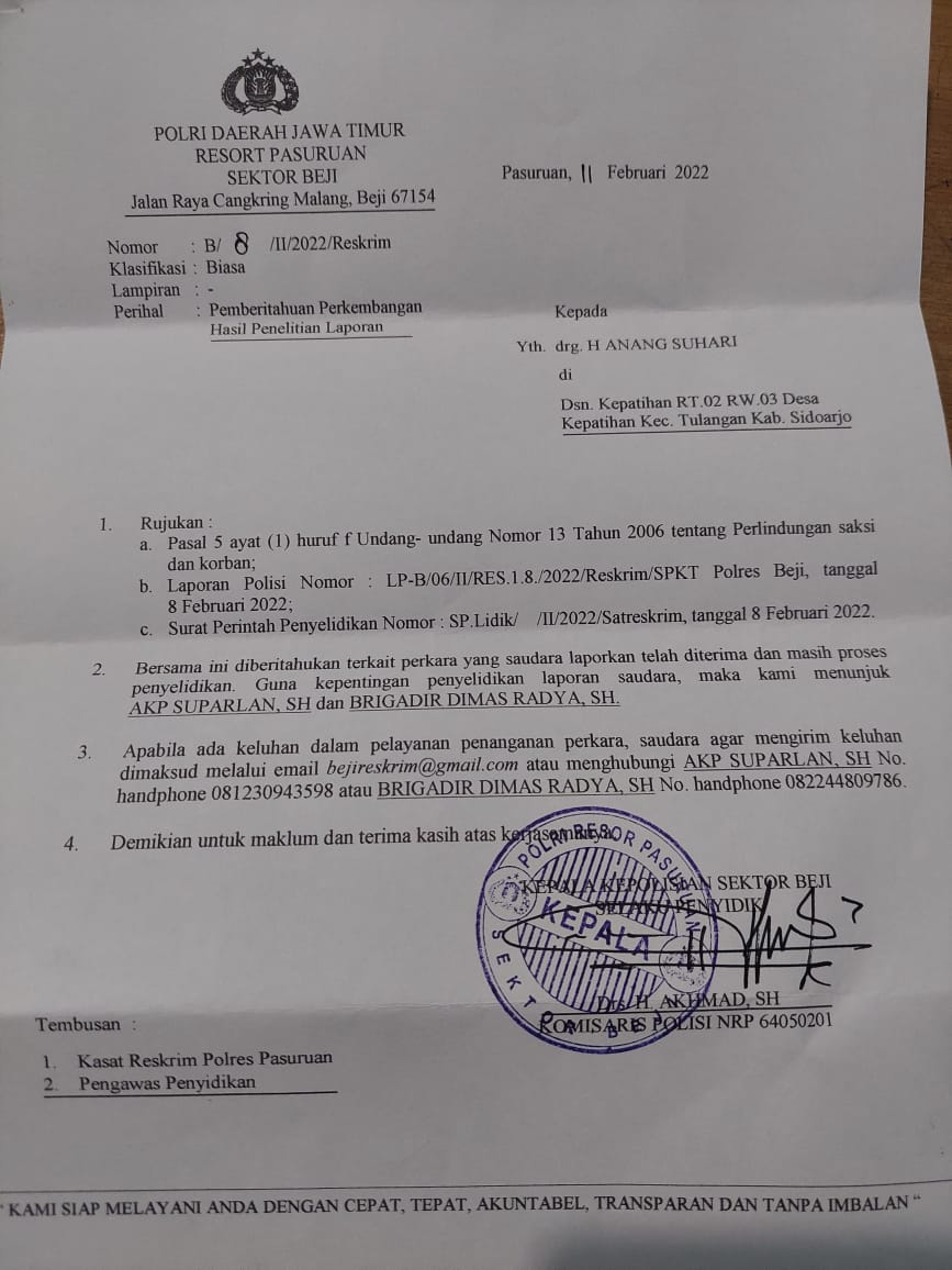Laporan Polisi (LP) No. LP-B/06/II/RES.1.8/2022Reskrim /SPKT polres Beji pada tanggal 8 februari 2022 itu ditindak lanjuti oleh Polsek Beji dengan mengeluarkan surat nomor : B/8/II/Reskrim tanggal 11 februari 2022 dengan status perkara itu dalam proses penyelidikan.