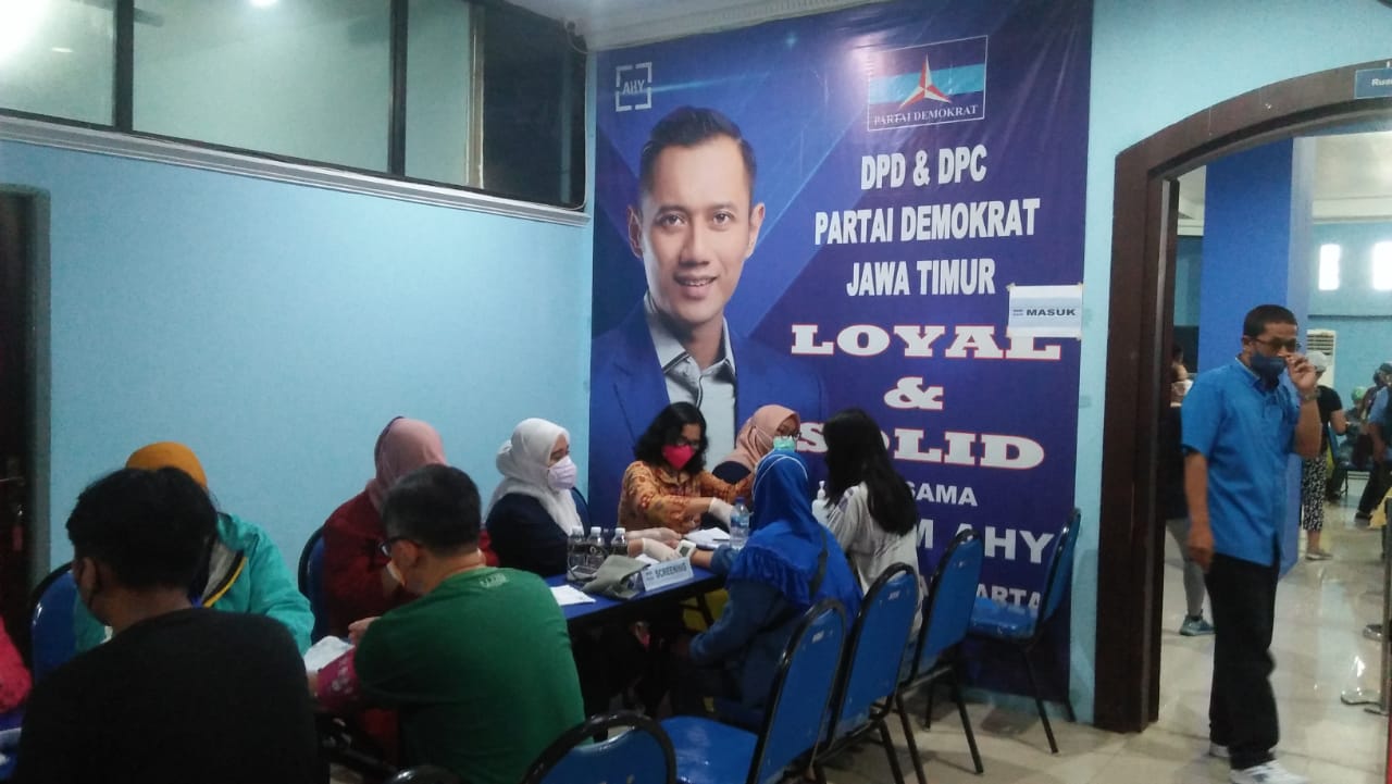 SURABAYA – Mendukung program pemerintah, DPD Partai Demokrat Jawa Timur memberikan 2.000 vaksin booster kepada warga di Surabaya. Warga pun berbondong-bondong mendatangi kantor partai berlambang Mercy di Jalan Kertajaya Indah, Sabtu (26/3/2022).
