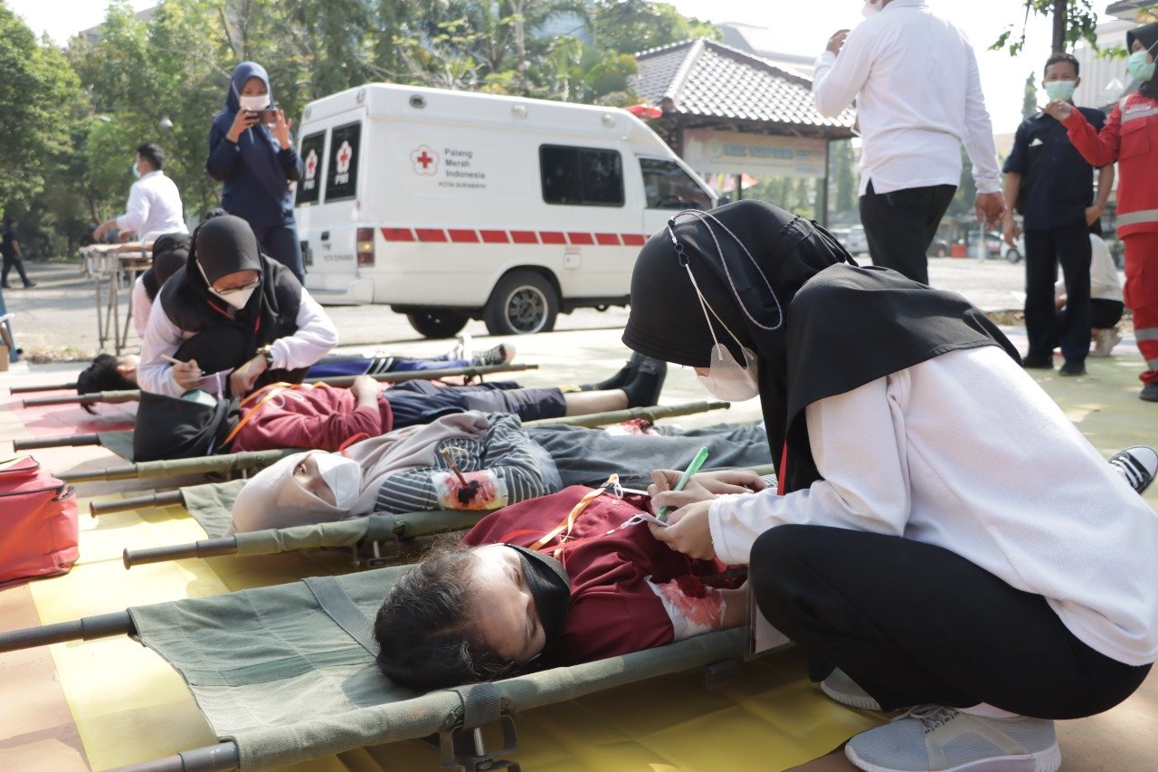 SURABAYA | BIDIK.NEWS – Fakultas Ilmu Kesehatan (Fikes) Universitas Dr. Soetomo (Unitomo) bekerjasama dengan Unit Transfusi Darah (UTD) Palang Merah Indonesia (PMI) Surabaya dan Badan Penanggulangan Bencana Daerah (BPBD) Jatim menggelar simulasi Tanggap Darurat Bencana di Lapangan Bola Basket Kampus Unitomo, Selasa (30/8/2022).