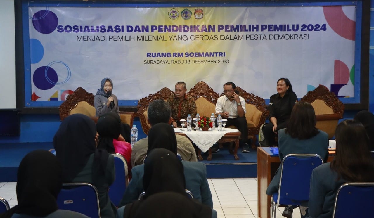 SURABAYA | bidik.news – Fakultas Ilmu Administrasi (FIA) Universitas Dr. Soetomo (Unitomo) berkerjasama dengan Komisi Pemilihan Umum (KPU) Jawa Timur menggelar Sosialisasi dan Pendidikan Pemilih Pemilu 2024, Rabu (13/12/2023). Kegiatan ini bertema “Menjadi Pemilih Milenial yang Cerdas dalam Pesta Demokrasi”.
