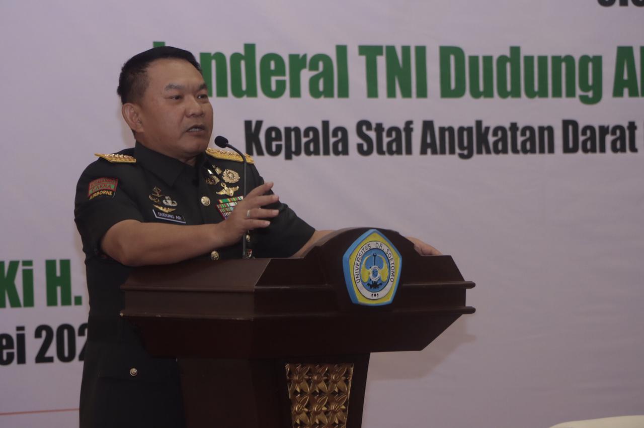 SURABAYA – Kepala Staf Angkatan Darat (KSAD) Jenderal TNI Dudung Abdurachman, SE, MM memberi kuliah umum bela negara bertema “Membangun Kebersamaan Dalam Keberagaman” (Building Togetherness in Diversity) di kampus Kebangsaan dan Kerakyatan Universitas Dr. Soetomo (Unitomo) Surabaya, Sabtu (21/5/2022).