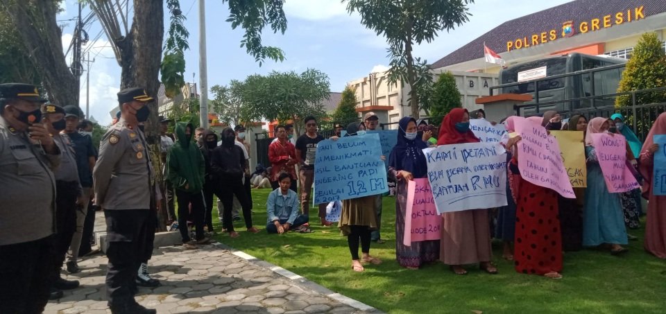 GRESIK– Aliansi Petani Tambak Rejo, Duduksampeyan ngeluruk Polres Gresik menuntut agar dugaan korupsi bantuan alat pertanian yang saat ini ditangani agar secepatnya diungkap.