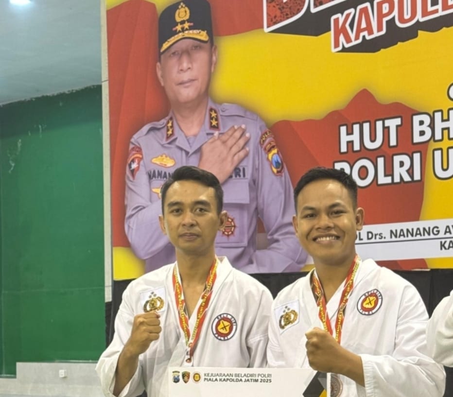 Dua atlet putra jawara laga bela diri, Briptu Akbar Maulana,dan Bripda Frenki Fernanda ini,berhasil meraih medali perunggu setelah bersaing ketat melawan 42 kontingen putra se-Jawa Timur.