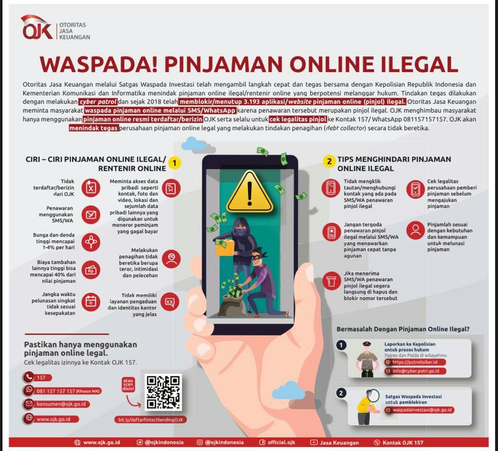 SURABAYA – Otoritas Jasa Keuangan (OJK) melalui Satgas Waspada Investasi telah mengambil langkah cepat dan tegas bersama Kepolisian RI dan Kementerian Kominfo menindak pinjaman online (pinjol) ilegal/rentenir online yang berpotensi melanggar hukum.