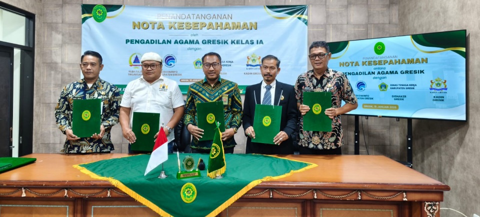 Nota kesepahaman tersebut ditandatangani oleh Ketua PA Kelas IA Gresik Ahmad Zainal Fanani, Direktur YLBH FT Andi Fajar Yulianto, Kepala Dinas Kominfo Gresik Johar Gunawan, Kepala Disnaker Gresik Zainul Arifin, serta Wakil Ketua Kadin Gresik Nefa Indra Lesmana.