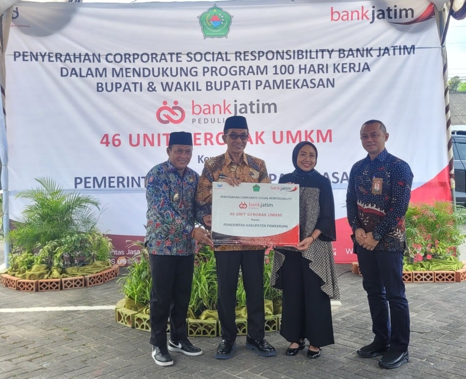 Untuk yang di Pamekasan, bantuan CSR berupa 46 unit gerobak UMKM diserahkan secara simbolis oleh Direktur Kepatuhan Bank Jatim Umi Rodiyah kepada Bupati Pamekasan KH Kholilurrahman. Kemudian untuk di Probolinggo, bantuan CSR berupa pembangunan satu pujasera dan kamar mandi umum di Kawasan Stadion Gelora Merdeka Kraksaan diserahkan oleh Corporate Secretary Bank Jatim Fenty Rischana K kepada Staf Ahli Bidang Hukum, Pemerintahan, dan Pembangunan Pemkab Probolinggo A’at Kardono.