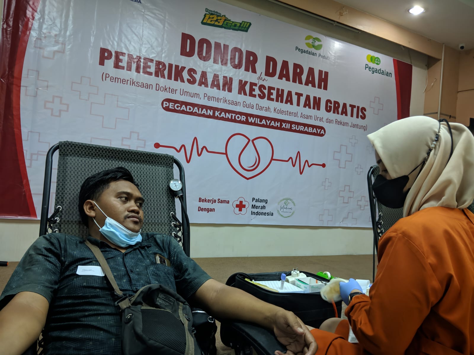 Donor darah ini diikuti 100 insan Pegadaian yang terdiri atas karyawan Pegadaian dan masyarakat umum. Kegiatan donor darah ini bekerja sama dengan Palang Merah Indonesia (PMI) Kota Surabaya, sedangkan untuk pemeriksaan kesehatan gratis berkolaborasi dengan Klinik Pratama Pegadaian Permata Surabaya.