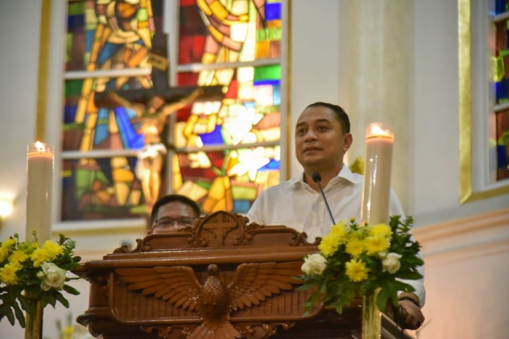 “Jadi undang Gereja Mawar Sharon, Gereja Bethany, pendeta berdoa di sini. Dan seluruh jemaat Nasrani, Kristen Protestan dan Katholik yang ada di Kota Surabaya harus hadir,” kata Eri.
