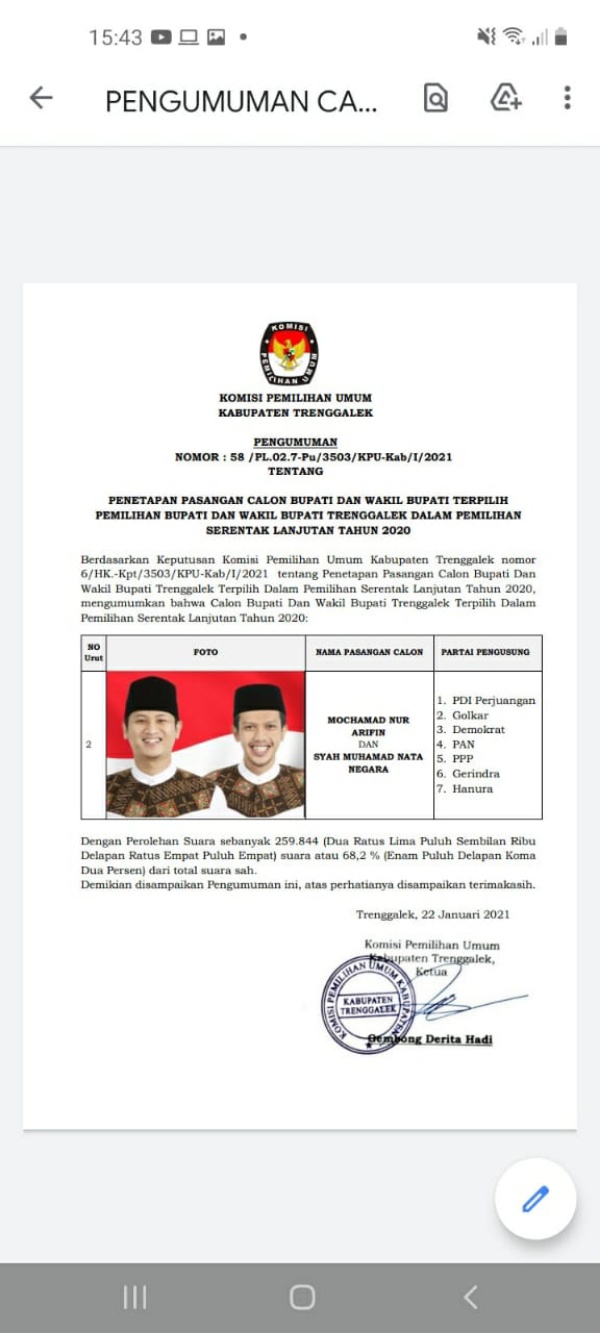 Pengumuman Penetapan Bupati dan Wakil Bupati Terpilih Kabupaten Trenggalek Dalam Pilkada Serentak 1