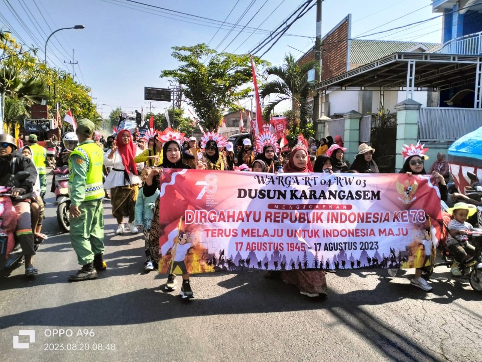 GRESIK I bidik.news – Pemdes Karangandong Kecamatan Driyorejo Kabupaten Gresik Jawa Timur menggelar karnaval budaya. Kegiatan ini dalam rangka HUT ke-78 Kemerdekaan RI.