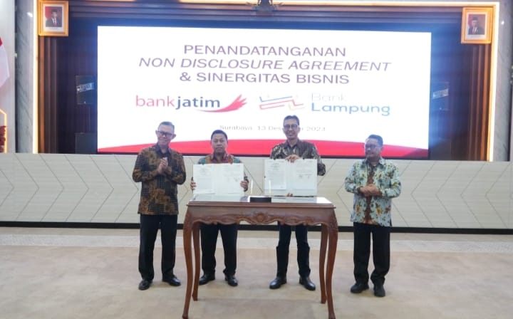 SURABAYA l bidik.news – Sebagai tindak lanjut dari penandatanganan MoU terkait pembentukan Kelompok Usaha Bank (KUB) PT Bank Pembangunan Daerah Jawa Timur Tbk (bankjatim) dengan PT Bank Pembangunan Daerah Lampung (Bank Lampung) beberapa waktu lalu, pada hari Rabu (13/12) telah dilaksanakan penandatanganan Non Disclosure Agreement (NDA) tentang Pertukaran Informasi dalam Rangka Penyertaan Modal dan sekaligus penandatanganan Perjanjian Kerja Sama (PKS) Sinergitas Bisnis antara kedua belah pihak. Bertempat di Kantor Pusat bankjatim, penandatanganan NDA dilakukan oleh Direktur Utama bankjatim Busrul Iman dan Direktur Utama Bank Lampung Presley Hutabarat dengan disaksikan oleh Komisaris Independen bankjatim Prof. Muhammad Mas’ud dan Komisaris Utama Bank Lampung Fahrizal Darminto.