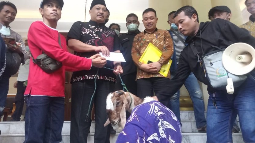 “Kami warga Gresik sangat tersinggung atas perilaku amoral dua anggota dewan yang terhormat yang terlibat memfasilitasi pernikahan manusia dengan hewan. Karena itu, kami bawa juga kambing ke sini sebagai simbol untuk menguatkan betapa mereka tidak bermoral, karena menyamakan manusia dengan hewan, yaitu seekor kambing. Masak manusia dinikahkan dengan kambing,” ujar Koordinator Aksi Aliansi WC Sahrudin, didampingi Humasnya Abdullah Syafi’i, sambil menuntun seeokor kambing memasuki gedung DPRD Gresik.