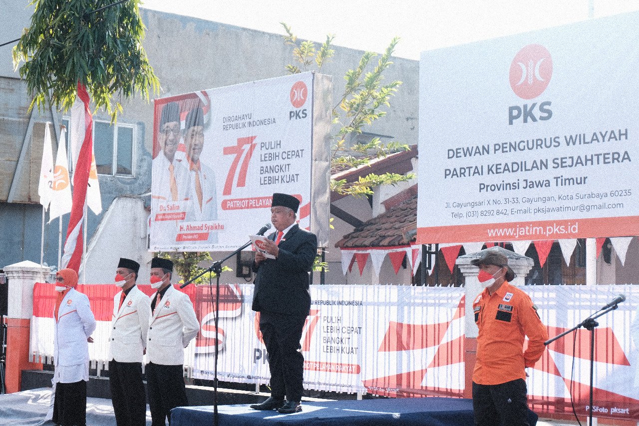 SURABAYA | BIDIK.NEWS – DPW PKS Jatim menggelar upacara Peringatan HUT ke-77 RI di Halaman Kantor DPW, pada rabu (17/8/2022). Upacara yang dimulai pukul 07;00 tepat itu diikuti oleh segenap pengurus DPW, PKS Muda, Gema keadilan Jawa Timur, dan Perempuan PKS yang mengikuti dengan khidmad. Upacara Bendera juga dilaksanakan serentak di 38 DPD PKS Kab/kota se-Jawa Timur.