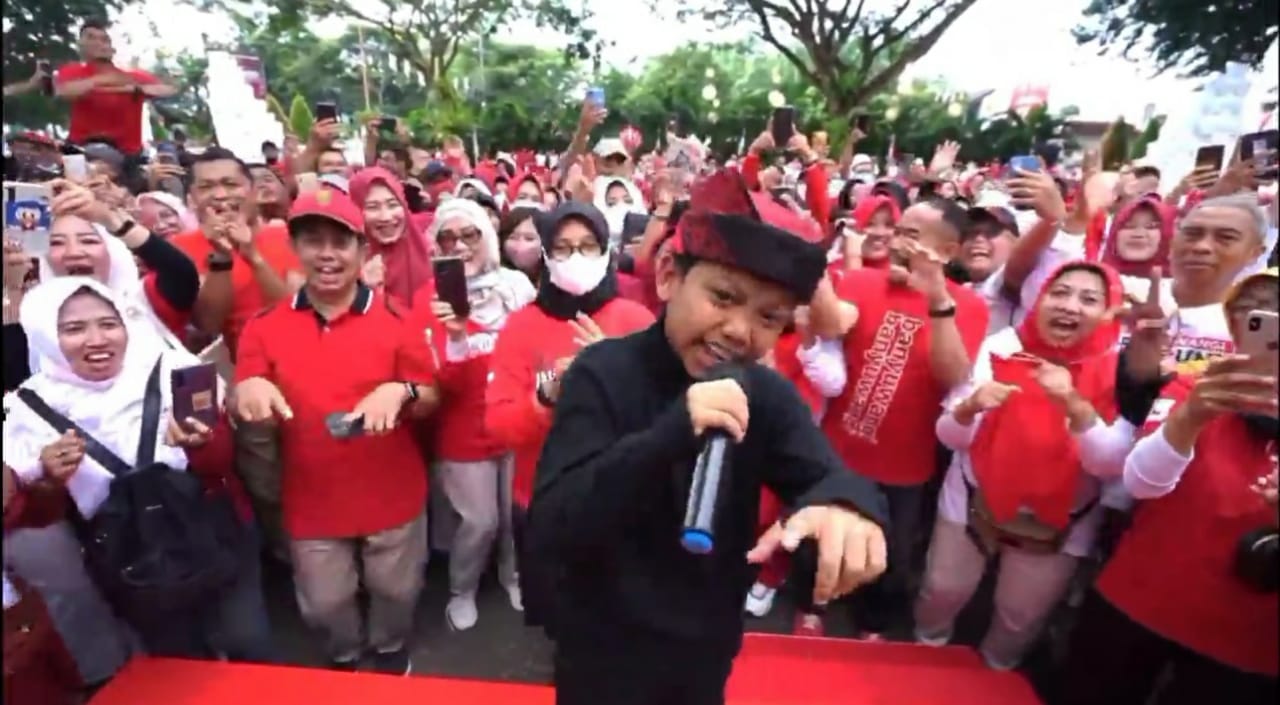 Farel pun langsung mendendangkan lirik lagu ‘Wong ko ngene kok dibanding-bandingke, Saing-saingke, yo mesti kalah’…sontak Bupati Banyuwangi Ipuk Fiestiandani dan puluhan ASN yang hadir langsung bersorak ria turut melantunkan lagu sambil bergoyang.