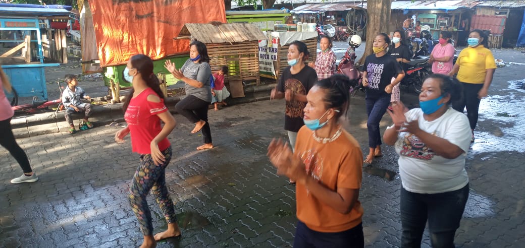 ” Kami mengajarkan gerakan peregangan otot, dari kepala, tangan, kaki, dan juga kombinasi dengan musik ritmik yang menyenangkan,” jelas bunda Iin.