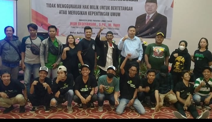 SURABAYA | BIDIK.NEWS – Anggota Fraksi Partai Gerindra DPRD Jatim dari Dapil Surabaya Hadi Dediyansah , S.Pd , M.Hum menyampaikan unsur masyarakat baik itu Bonek maupun komunitas pemuda yang tergabung dala m pecinta alam harus dilibatkan dalam mengisi dan memikirkan pembangunan Surabaya agar peran serta mereka ikut terlibat ,karena selama ini Pemerintah kota Surabaya tidak pernah melibatkan mereka.