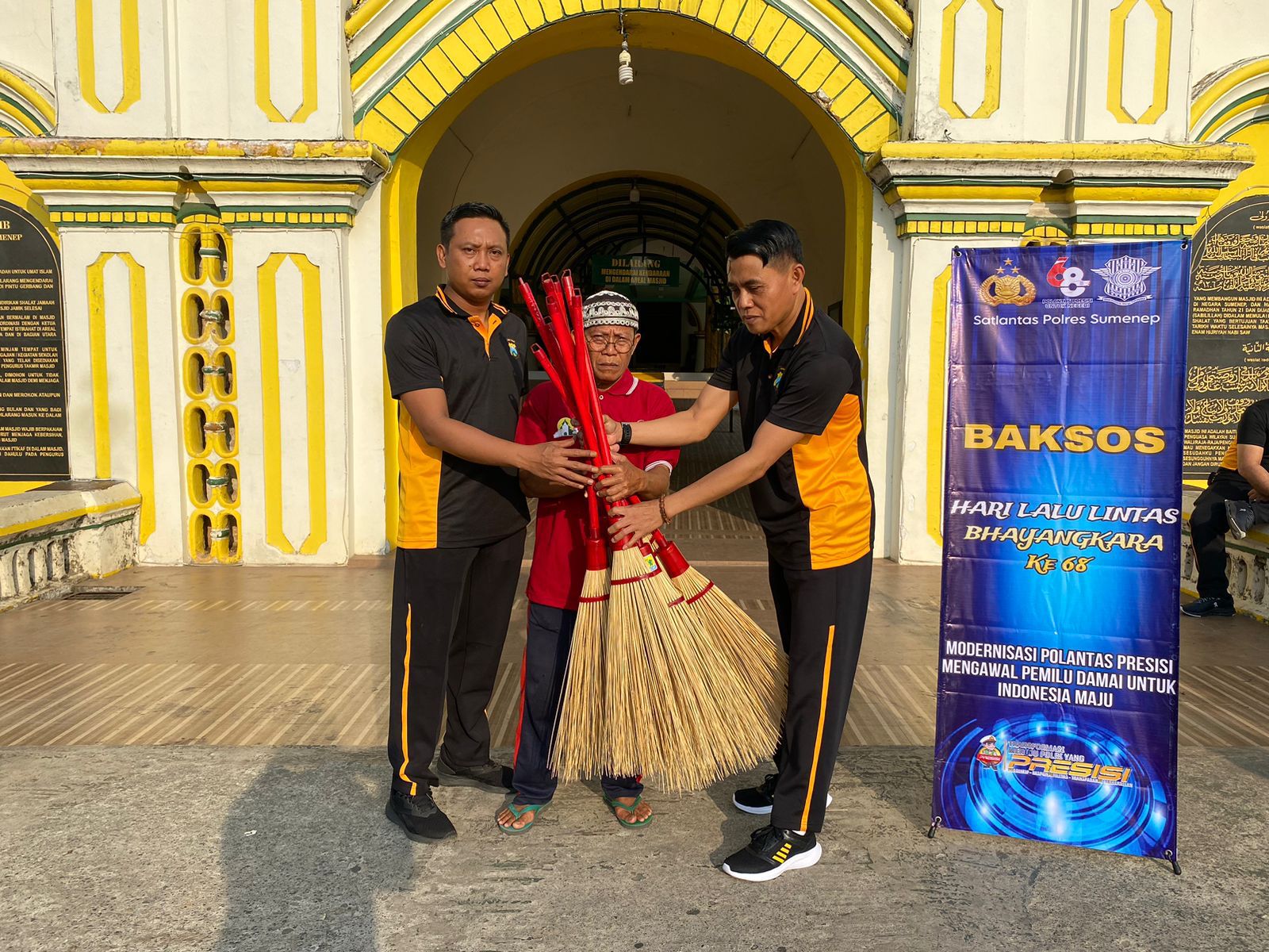 Kegiatan ini sebagai bentuk kepedulian terhadap masyarakat, serta dalam rangka memperingati HUT Lalu Lintas Bhayangkara ke-68, jajaran Satlantas Polres Sumenep menggelar kegiatan bakti sosial, religi dengan melakukan kerja bakti membersihkan masjid Jamik Sumenep