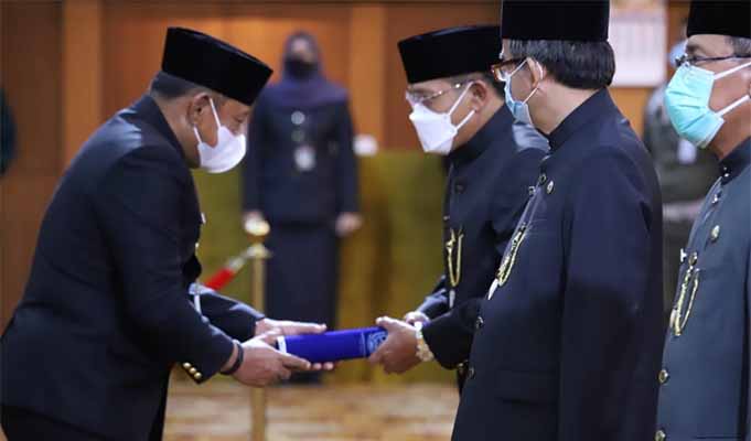 Sekdaprov Heru menyerahkan petikan pelantikan kepada Pejabat Tinggi Pratama yang baru dilantik. (Ist)