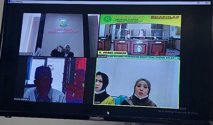 Terdakwa saat sidang online dan dua istri terdakwa memberikan keterangan di PN Gresik