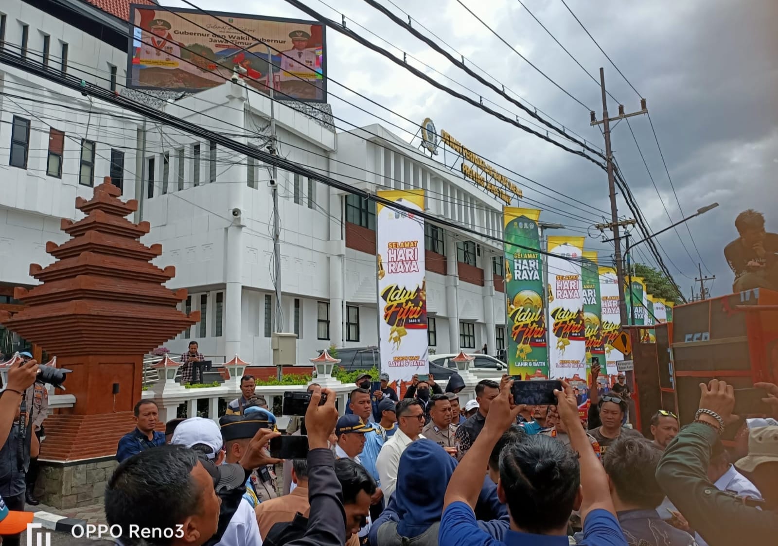 “Kami mendesak untuk ketemu ketua DPRD Jatim,Musyafak Rouf,” teriak korlap aksi.
