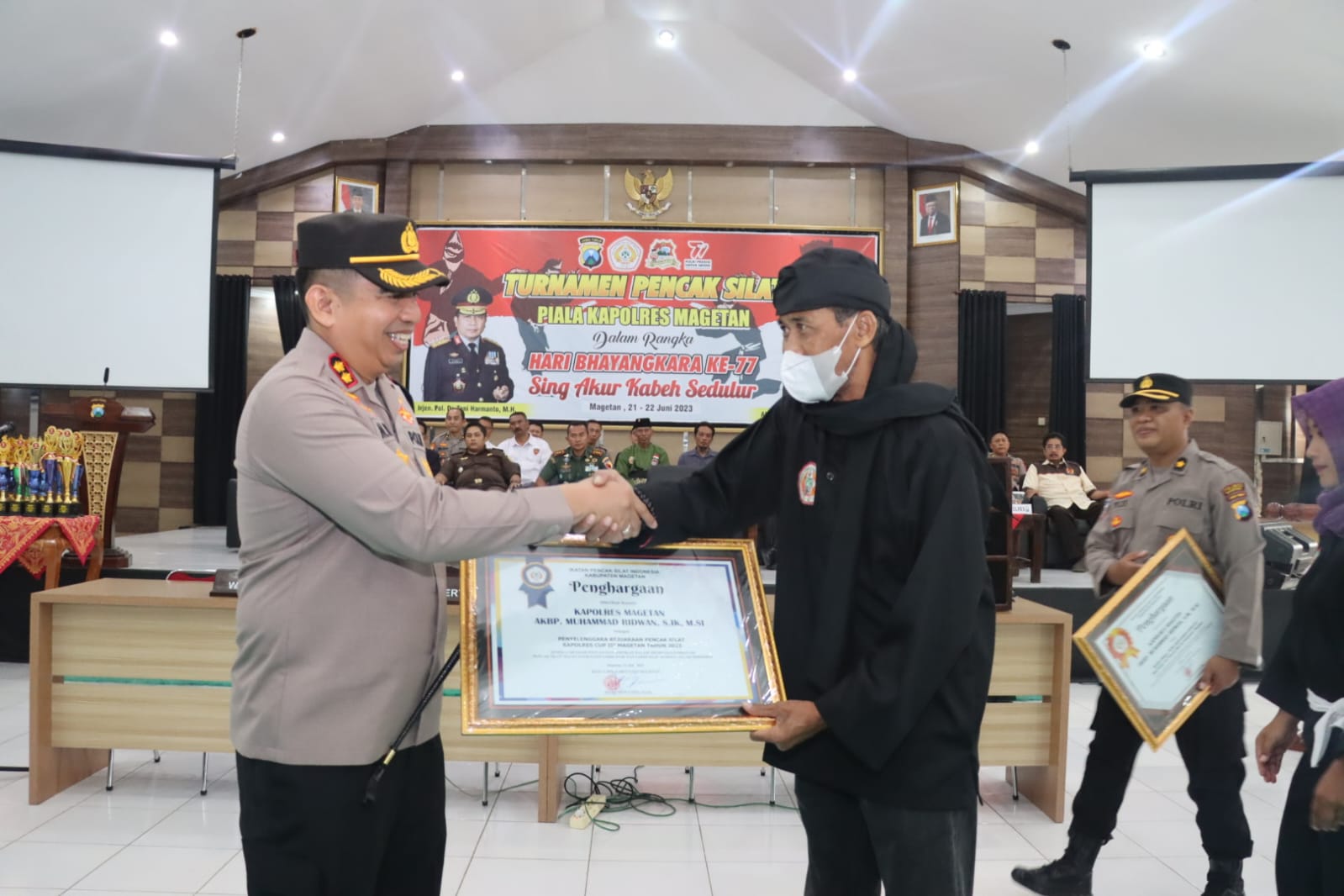 Dalam turnamen pencak silat Kapolres Cup.3 yang dilaksanakan selama dua hari ini, Ketua Ikatan Pencak Silat (IPSI) Magetan Hari Siswanto mengapresiasi dengan memberikan dua piagam sekaligus kepada orang no.1 dijajaran Kepolisian Resort Magetan, atas dedikasi serta perjuangannya dalam memberikan suasana yang nyaman sejuk damai guyub rukun pada setiap perguruan pencak silat yang ada di Magetan ini,