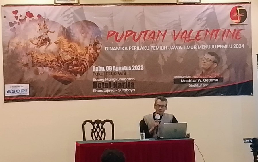 Direktur Surabaya Survey Center (SSC) Mochtar W. Oetomo saat press conference di hotel Narita Rabu (9/8/2023). (foto: hari)