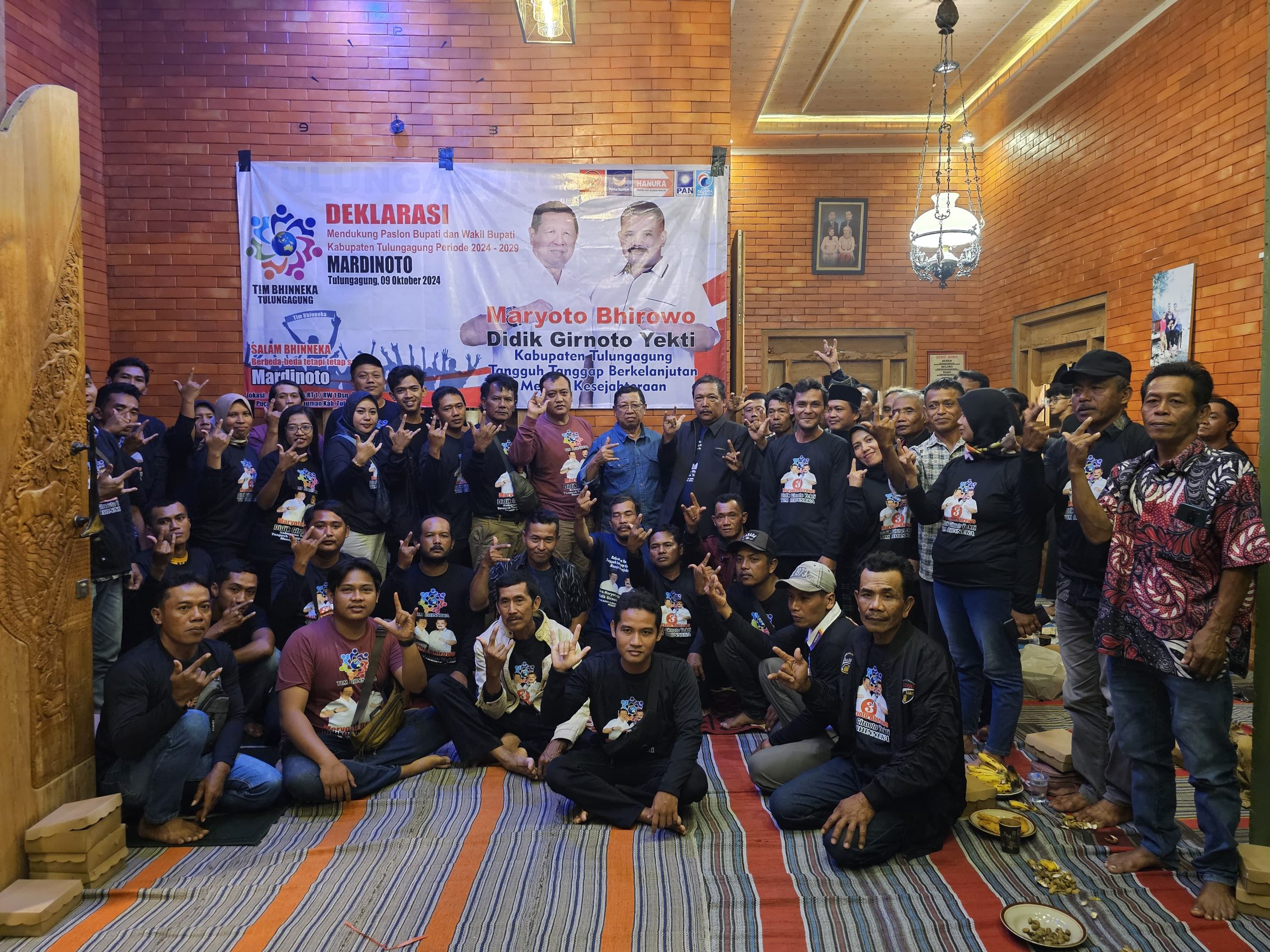 TULUNGAGUNG l bidik.news- Pengusaha muda Rahmat Putra Perdana bersama relawan tim Bhinneka Kabupaten Tulungagung mendeklarasikan dukungan untuk calon Bupati dan Wakil Bupati Maryoto Bhirowo – Didik Girnoto Yekti pada Pemilihan Kepala Daerah Kabupaten Tulungagung, Jawa Timur.