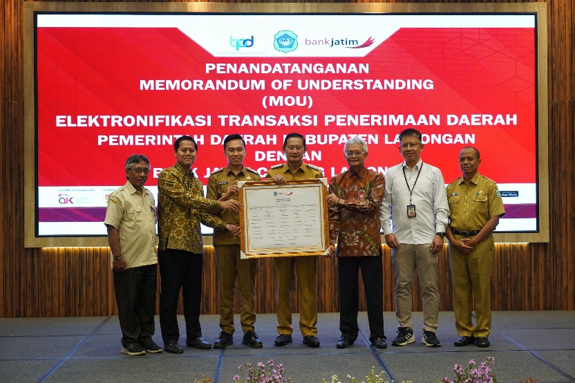 SURABAYA l bidik.news – PT Bank Pembangunan Daerah Jawa Timur Tbk (Bank Jatim) bersama dengan Pemkab Lamongan telah melakukan tiga kegiatan sekaligus. Yaitu penandatanganan MoU Elektronifikasi Transaksi Pemerintah Daerah (ETPD) antara Pemkab Lamongan dengan Bank Jatim Cabang Lamongan, penandatanganan Pakta Integritas Tim Percepatan dan Perluasan Digitalisasi Daerah (TP2DD) Kabupaten Lamongan, serta penyerahan CSR berupa revitalisasi Alon – Alon kepada Pemkab Lamongan pada Selasa ( 4/3/2025 ).
