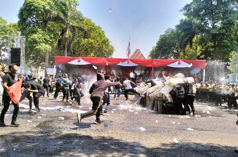 Simulasi yang dilaksanakan sebagai persiapan pengamanan pemilu 2024 ini juga digelar di depan Pendopo Shaba Swagata Blambangan, Selasa (17/10/2023).
