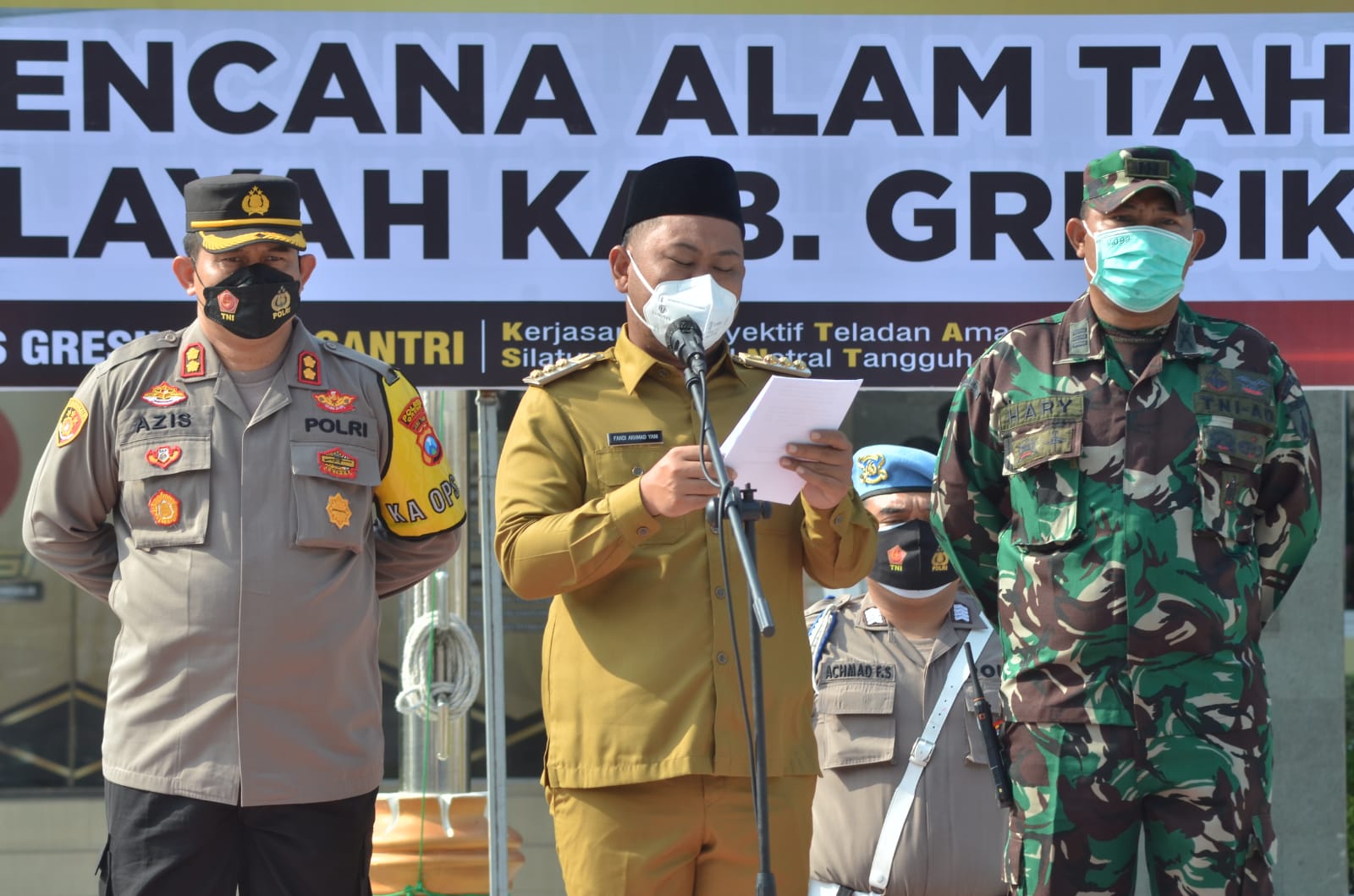 Bupati, Dandim, Kapolres Gresik, memimpin upacara mitigasi bencana.