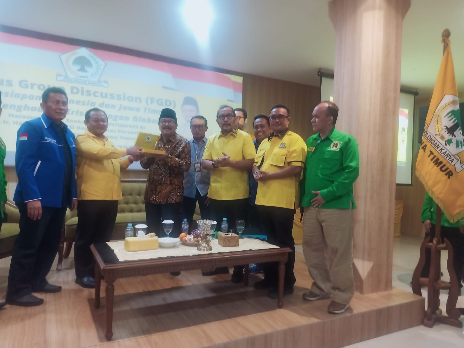 SURABAYA – Tiga Parpol (Golkar, PAN dan PPP) yang tergabung dalam Koalisi Indonesia Bersatu (KIB) di Jawa Timur menggelar Focus Group Discussion (FGD) bersama dengan anggota Wantimpres Dr H Soekarwo, SH, MHum dengan tema ‘Kesiapan Indonesia dan Jawa Timur Menghadapi Krisis Pangan Global’ di kantor DPD Partai Golkar Jawa Timur, Selasa (21/6/2022) .